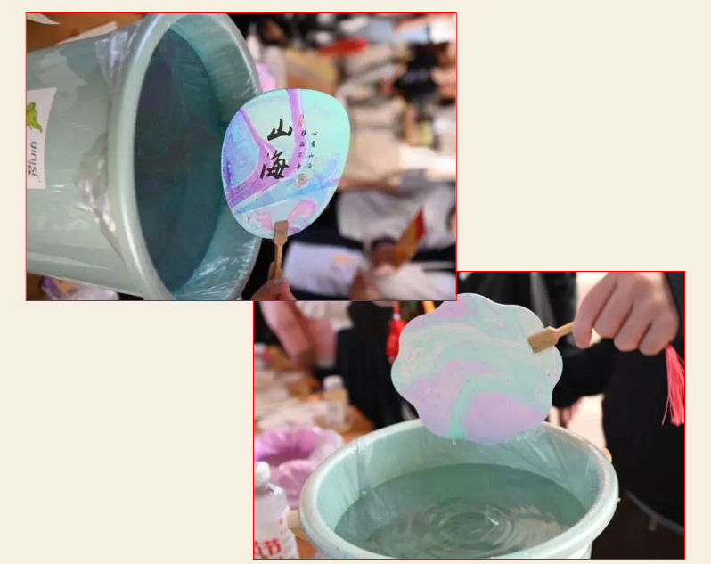 走进漆扇体验区,大家屏息凝神,将颜料滴入水中,以漆为笔,以水为墨。扇面缓缓沉入,提转之间,独一无二的纹路便“破水而出”,将雅致的古风韵味定格在方寸之间。