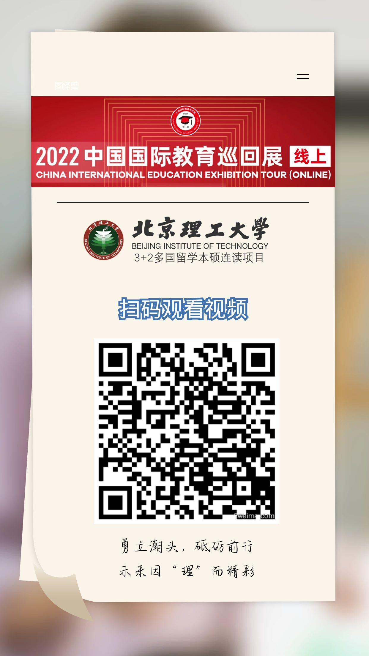 北京理工大学作为中国(教育部)留学服务中心的合作院校,受邀成为本次国际教育巡回展的参展院校之一。线上巡回展北京理工大学人文学院SQA中心招生官及学生代表,为大家全面介绍北京理工大学3+2多国留学本硕连读项目的具体情况及学习生活分享。今年意向报考我项目考生及家长可以观看视频详细了解。
